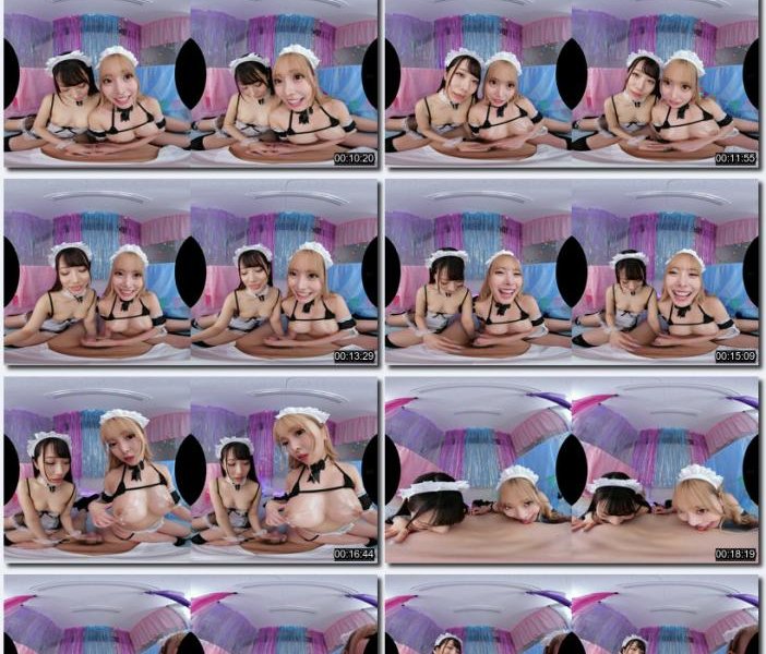 Fantasy virtual reality scenario where a teacher is seduced by two students as part of a school-based sex festival. Fellatio, handjob and paizuri-focused threesome with maid cosplay + light oil and restraint-play results in multiple cumshots